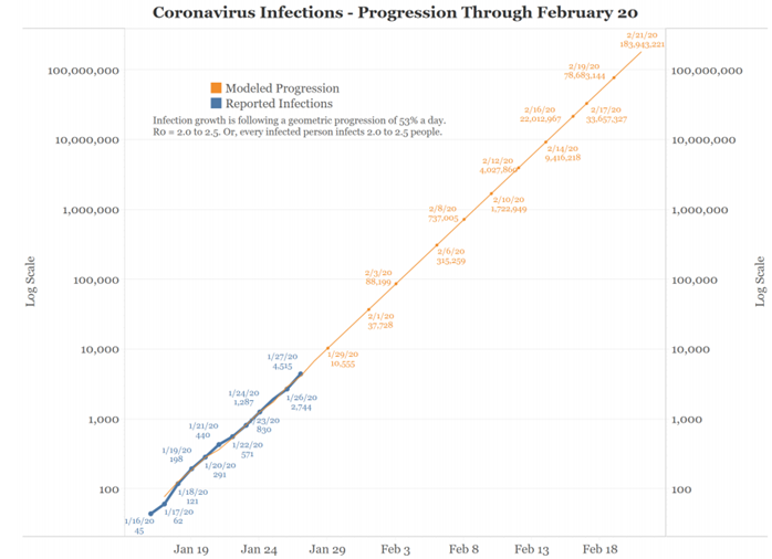 Coronavirus (labelled 2019-nCoV by the World Health Organisation) fears have sent shockwaves through global communities and financial markets in recent days. When the SARS outbreak occurred, China’s economy represented 4% of the global economy, today that number is over 16%. If the virus follows a simple progression model (i.e., assume a 53% increase in cases as reported, where each infected person transfers the virus to 2 to 2.5 people) then by 20 February 2020 we can expect to have over 100 million cases of Coronavirus worldwide, according to China National Health Commission Daily Reports (chart below).